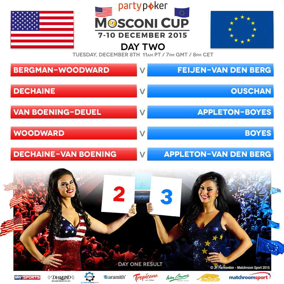 Das war es nun mit einem kurzen Review des ersten Tages vom MOSCONI CUP 2015. Heute Abend geht es bereits um 20:00 Uhr (MEZ) weiter mit folgendem LINE-UP (Begegnungen):